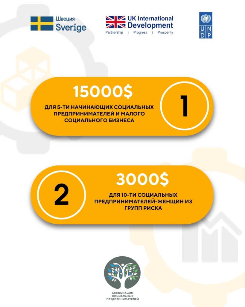 -до 15 000$ ( ООО, НКО,ИП, стартапы, нацеленные на решение социальных проблем)